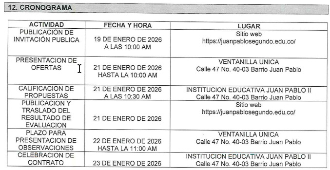Para tal efecto LA INSTITUCIÓN EDUCATIVA JUAN PABLO II convoca a las personas naturales, jurídicas, para que participen en el presente proceso de selección y adjudicación del contrato para el uso de los espacios físicos a título oneroso para la prestación del servicio exclusivo de las tiendas escolares en las sedes de la institución educativa, la selección se efectúa por convocatoria pública de acuerdo con los principios de publicidad y selección objetiva garantizando la pluralidad de oferentes